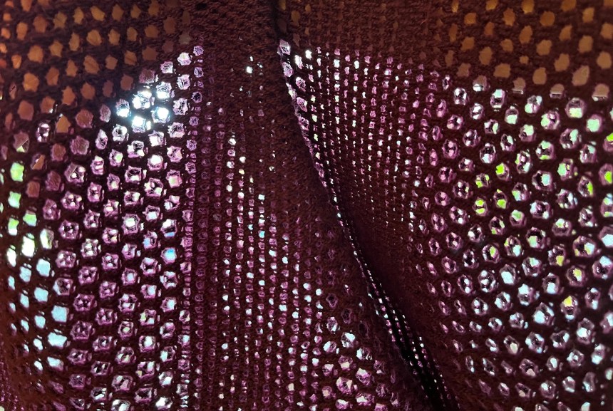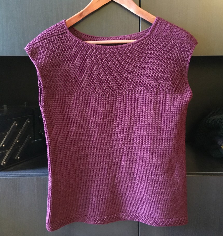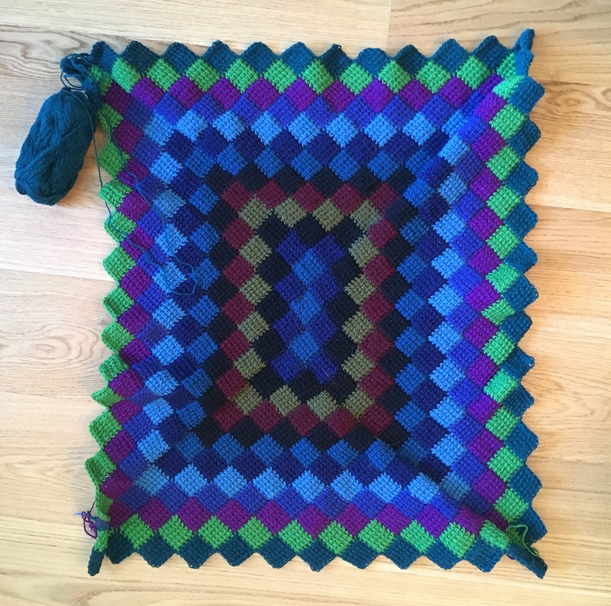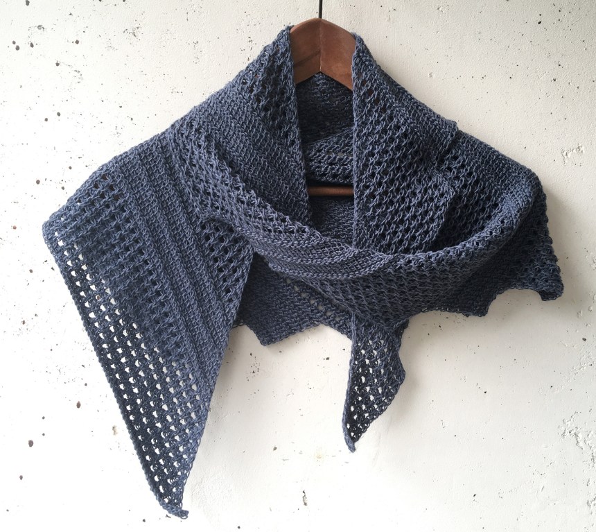 Notat: Bølgene lages ved å hakke 3 masker sammen i spissene nedover, og å øke på hver side av to hakkemasker der spissene peker oppover. Det hakkes rundt med ett nøste uten å snu arbeidet, ved å lenke sammen hver omgang.