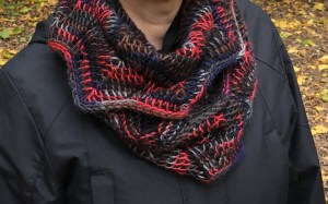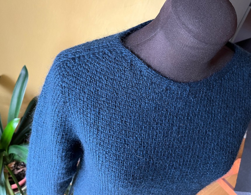 Av en eller annen grunn kjennes det som juks å lage en hals ved å hakke den flat (som et skjerf) og så sy endene sammen. Dessuten liker jeg ikke unødvendige sømmer. Her har jeg løst det ved å hakke rundt, frem og tilbake: Det trengs en hakkenål med vaier som har plass til alle maskene, og så lenker man slutten og begynnelsen av hver omgang sammen. Sammenlenkingen er så og si usynlig.