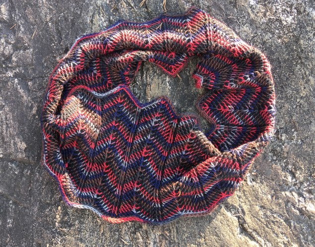 Jeg prøver meg på en oppskrift! Gi meg gjerne en tilbakemelding om noe er uklart. Oppskriften tar utgangspunkt i at man har kjennskap til vanlig hakking, og bruker garn med strikkefasthet cirka 25m = 10 cm på pinner 3mm. Den avbildede halsen er laget i Viking Silk Alpaca fra mitt litt for store garnlager. Dette garnet er dessverre utgått, men Sandnes Tove og Drops alpaca har omtrent samme tykkelse. Du kan fint bruke andre tykkelser. Hvilket som helst garn i en myk kvalitet, bare tilpass antall masker for å få riktig lengde. Masketall må kunne deles på 15. For dobbel hals bør lengden være minst 60 cm.