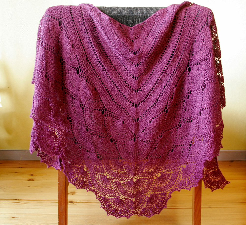I et søk på Pinterest kom jeg over noen fantastiske sjal laget av Aoibhe Ni. De lignet ikke på noe tunisisk hekling – hakking – jeg noen gang hadde sett før så dette måtte utforskes. Mønster til en samling sjal «Legendary Shawls Tunisian» ble kjøpt på Ravelry. Mønstrene så komplett uforståelige ut, veldig spennende! Hun bruker en spesiell teknikk som ikke krever at man bruker hakkenål. Vanlig heklenål går helt fint. Man hakker smale rader om gangen. Heldigvis starter oppskriftene med en innføring i teknikken (men grunnleggende forkunnskap om hakking er nødvendig). Jeg valgte å prøve meg på sjalet Venus, resultatet ser du over. Når jeg først forsto systemet gikk det greit. Oppskrifter og informasjon finner du her.