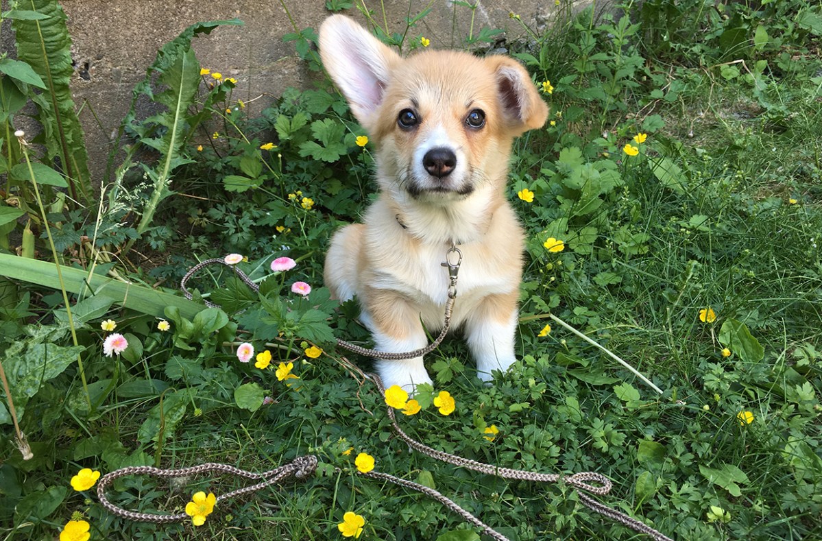 Verdens søteste valp med hundelenke laget med to tråder av polyestergarn på en lucet-gaffel. Det tok litt lengre tid enn jeg trodde (som vanlig), og jeg har ikke vært supernøyaktig siden lenken bare er beregnet for en måned eller to. Etter det er valpen enten for stor til lenken, eller har tygget den i stykker tenker jeg.