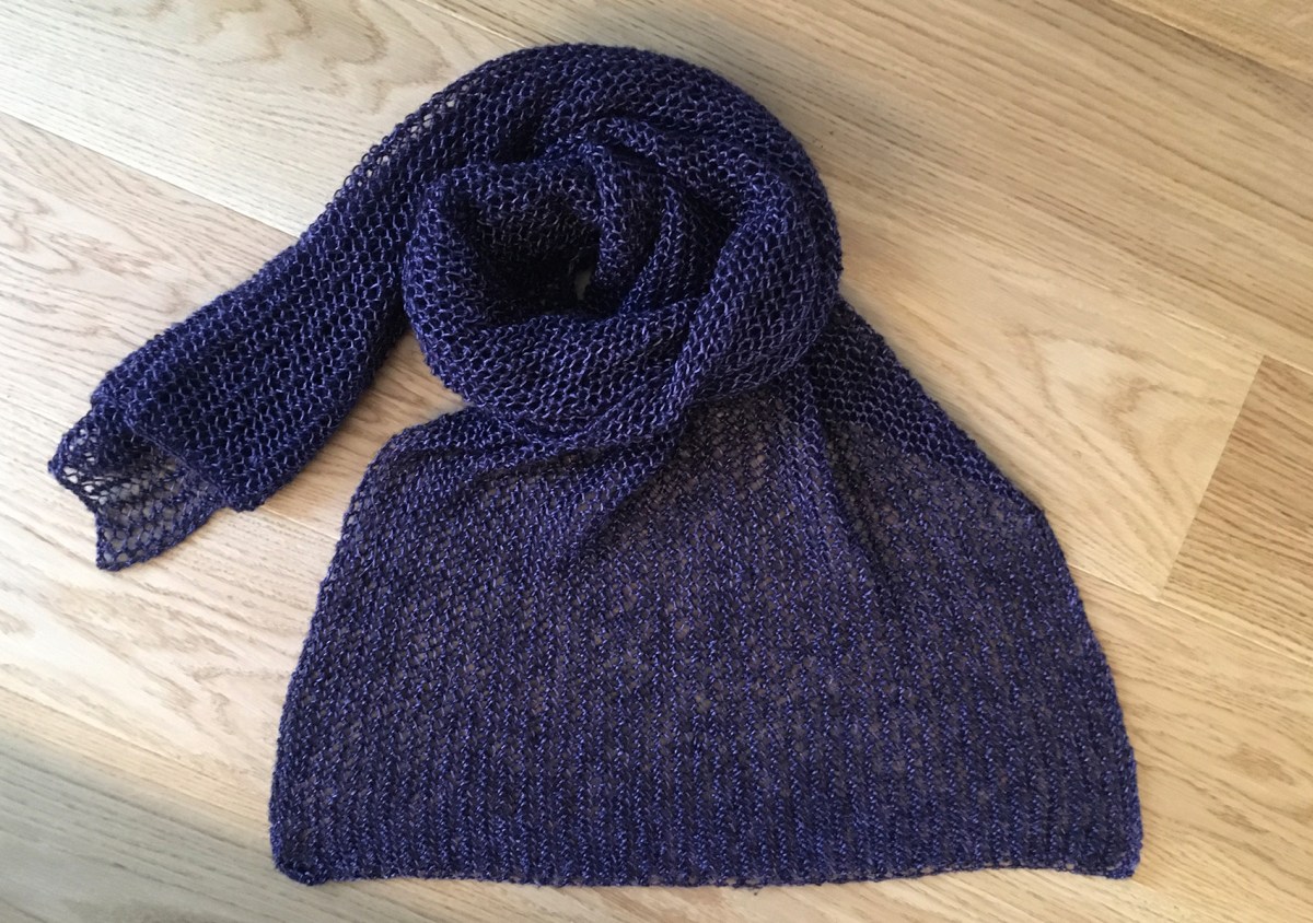 Det tok meg to år å finne det rette prosjektet for dette garnet! En skinnende blanding av ull og viskose – tynt og håpløst å rekke opp. Tre nøster kjøpt i Amsterdam – ikke rom for sløsing! Egentlig heter sjalet «Open air wrap» fra Purl Soho, og strikkeoppskriften finnes her.