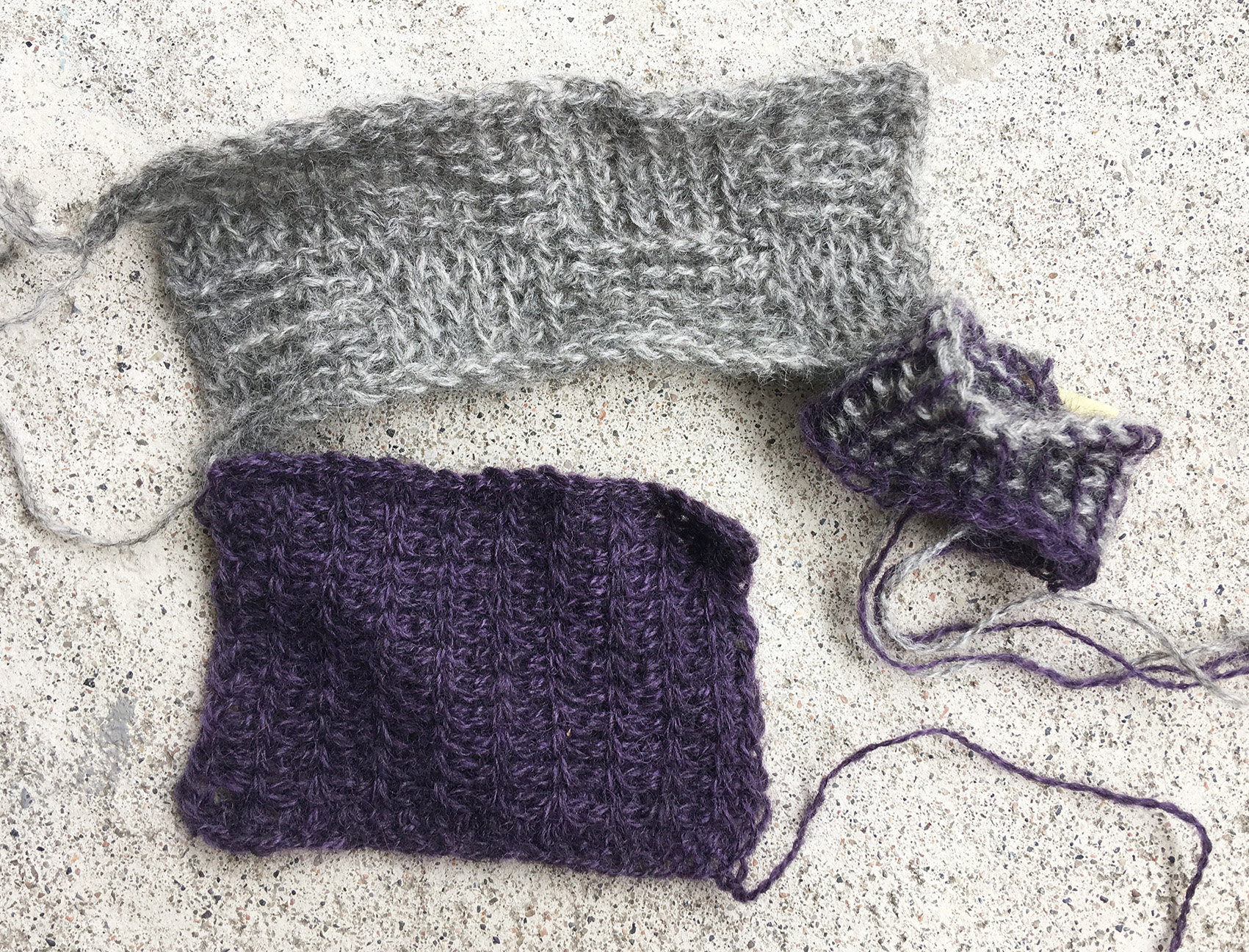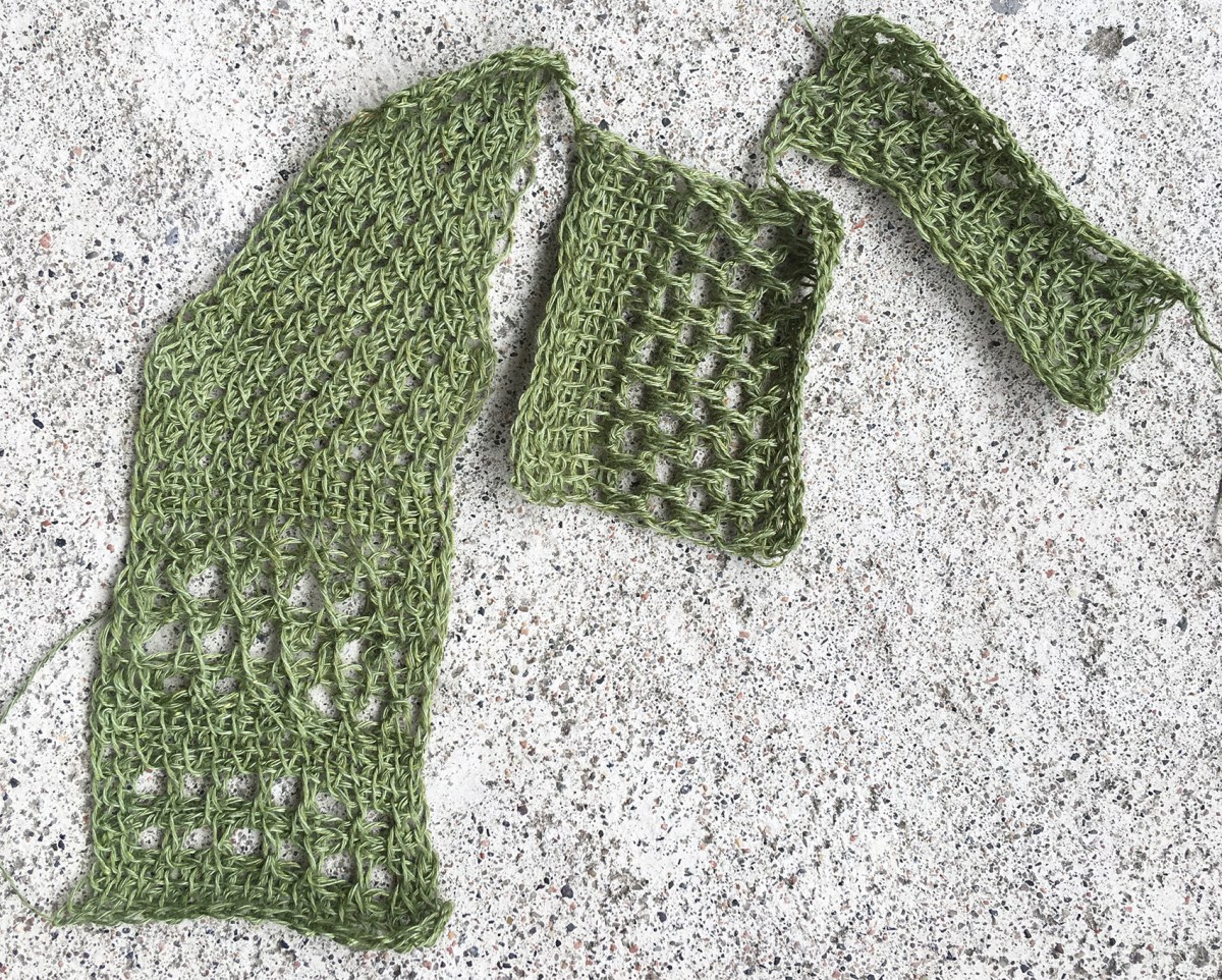 Uansett! Neste skritt er det morsomste i hele prosessen: Leke med det nye garnet! Teste hvilken størrelse hakkenål og hvilke masker eller maskekombinasjoner som passer best til akkurat dette garnet. Jeg koser meg med å hakke mange små prøvelapper. Noe ser jeg kjapt at ikke blir fint og rekker opp. Prøvelapper som virker lovende tar jeg vare på. Noen ganger oppdager jeg en ny type hakkemaske eller mønster, eller nye muligheter.