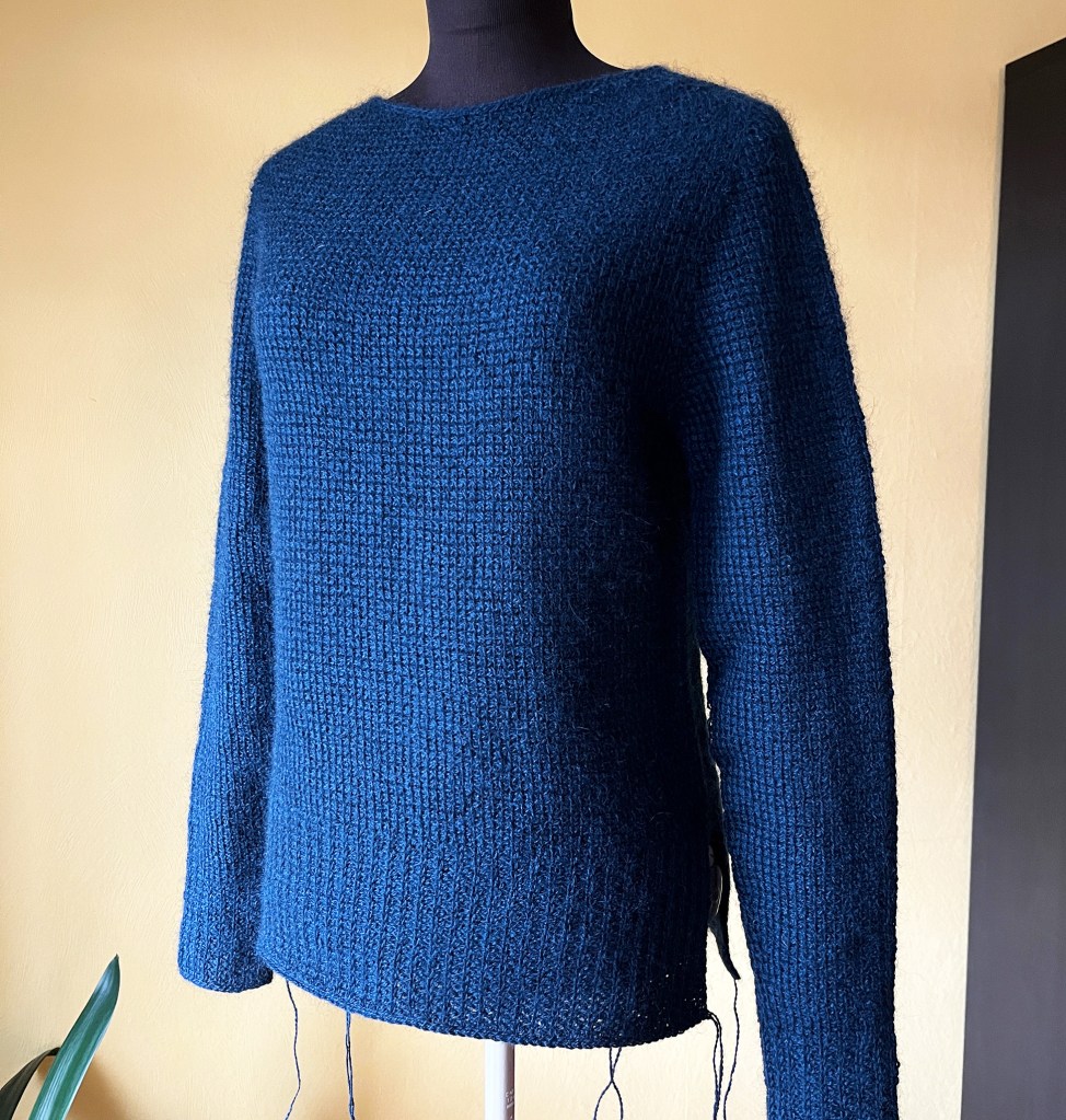 Vinterens utfordring: Å finne ut hvordan man hakker en genser med sadelskuldre sømløst ovenfra og ned. Som også har tilpasset hals med høyere nakke. Underveis har jeg lurt på hvor mange ganger man kan rekke opp uten at garnet blir stygt. Mange! Men det ble en genser til slutt 🙂